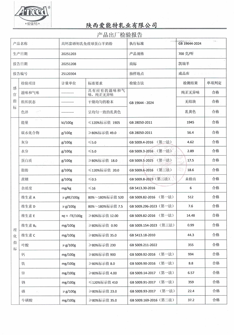 凯瑞羊高钙富硒初乳免疫球蛋白羊奶粉700克2025年12月3日检验报告