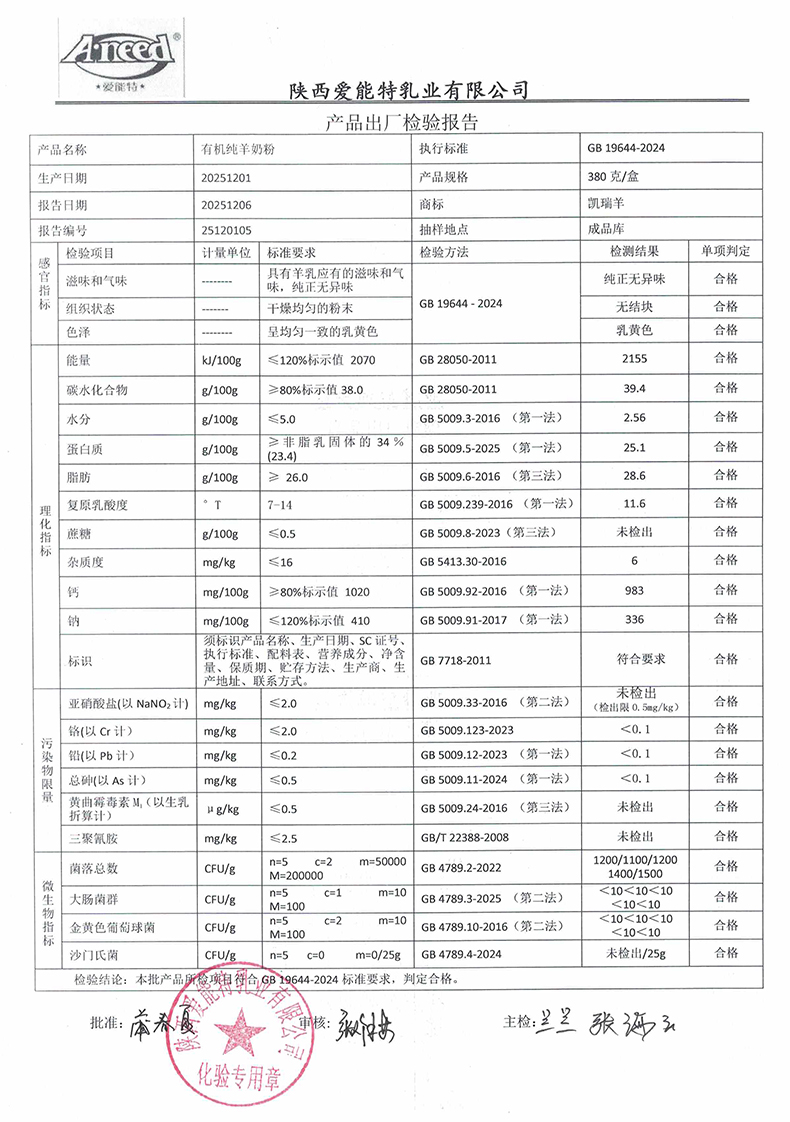 凯瑞羊有机纯羊奶粉380克2025年12月1日检验报告