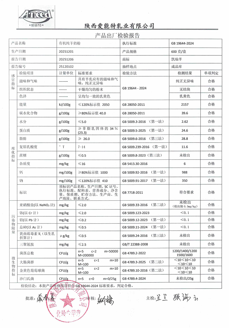 凯瑞羊有机纯羊奶粉600克2025年12月1日检验报告