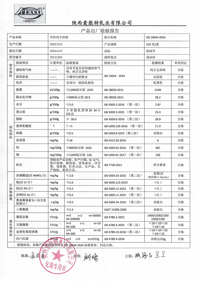 凯瑞羊有机纯羊奶粉520克2025年12月12日检验报告