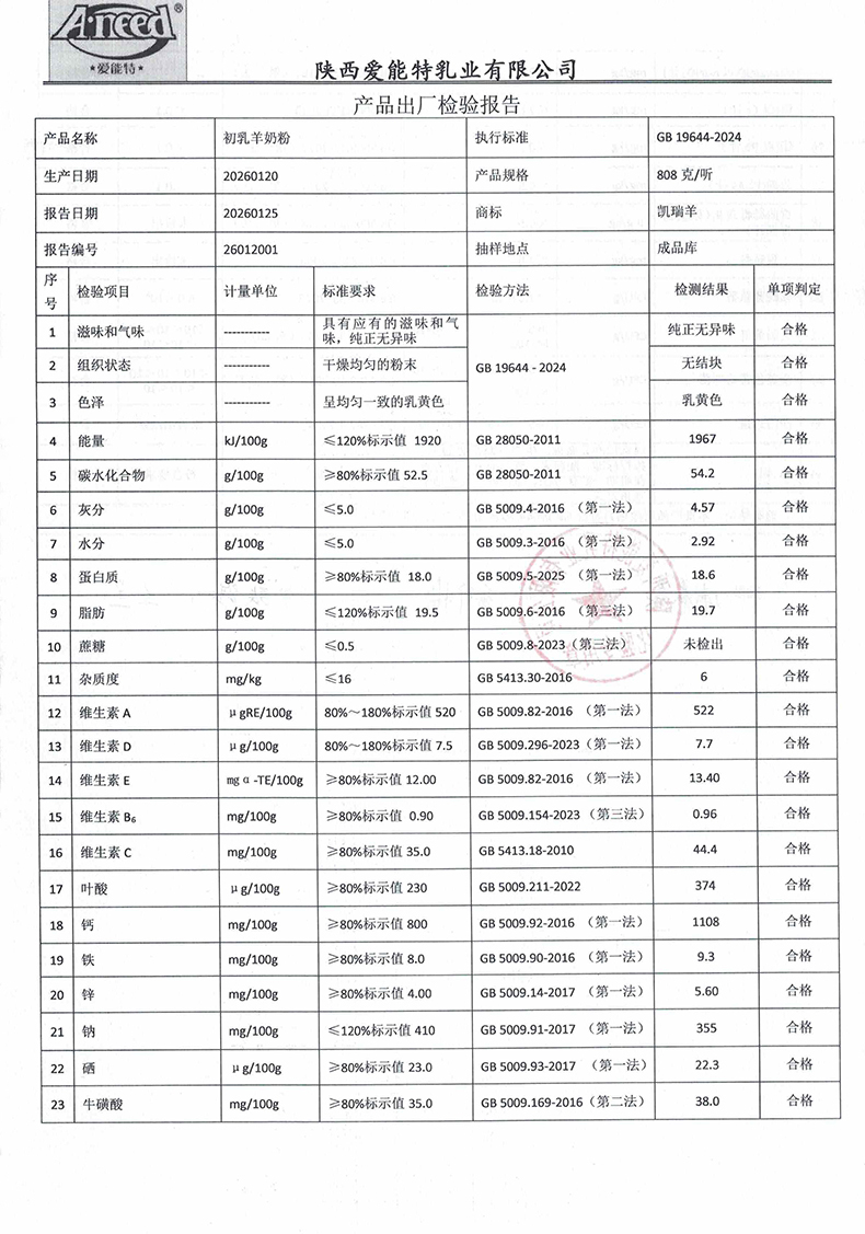 凯瑞羊初乳羊奶粉808克2026年01月20日检验报告