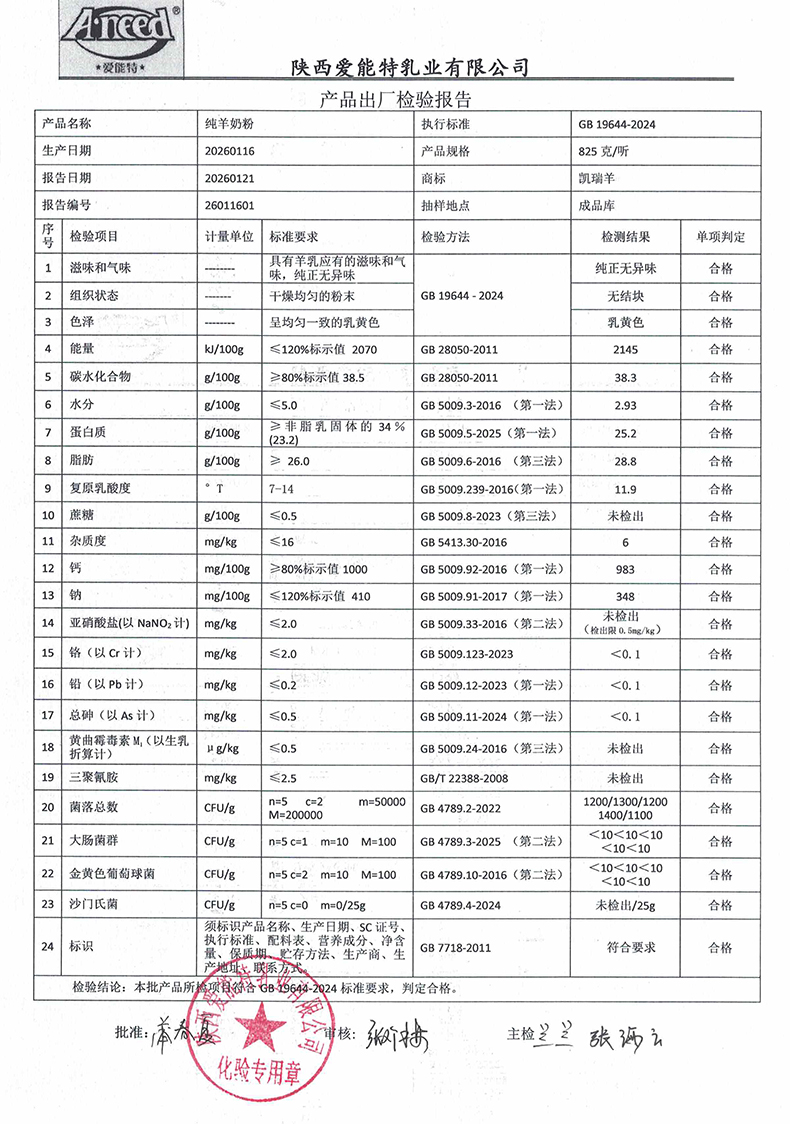 凯瑞羊纯羊奶粉825克2026年01月16日检验报告