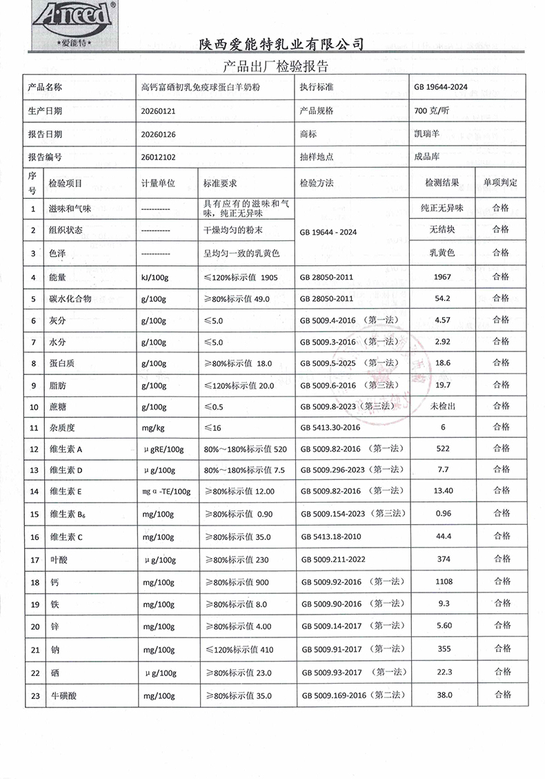 凯瑞羊高钙富硒初乳免疫球蛋白羊奶粉700克2026年01月21日检验报告