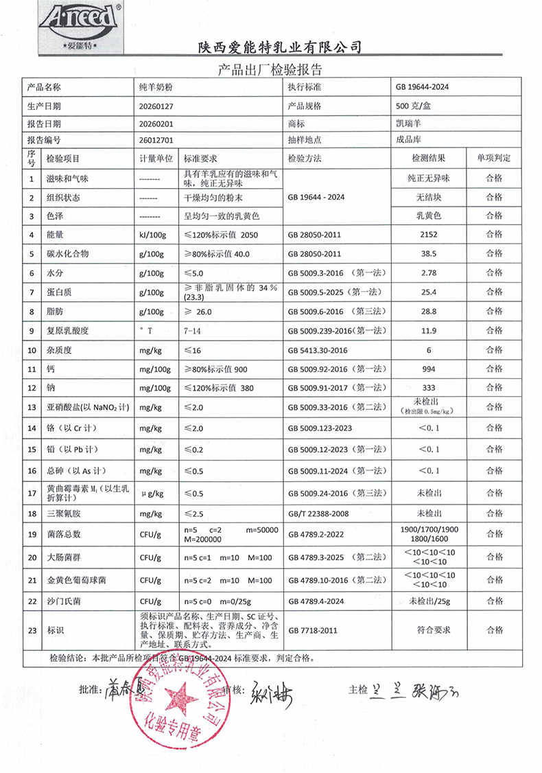 凯瑞羊纯羊奶粉500克 2026年01月27日检验报告