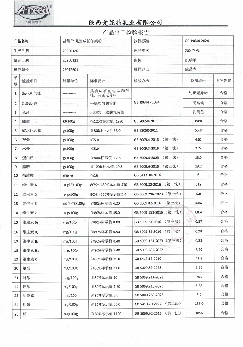益篙儿童成长羊奶粉700克2026年01月26日检验报告