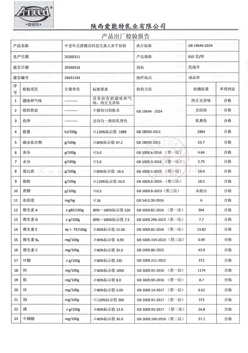 [下一页] 凯瑞羊高钙富硒羊奶粉420克2026年03月10日检验报告