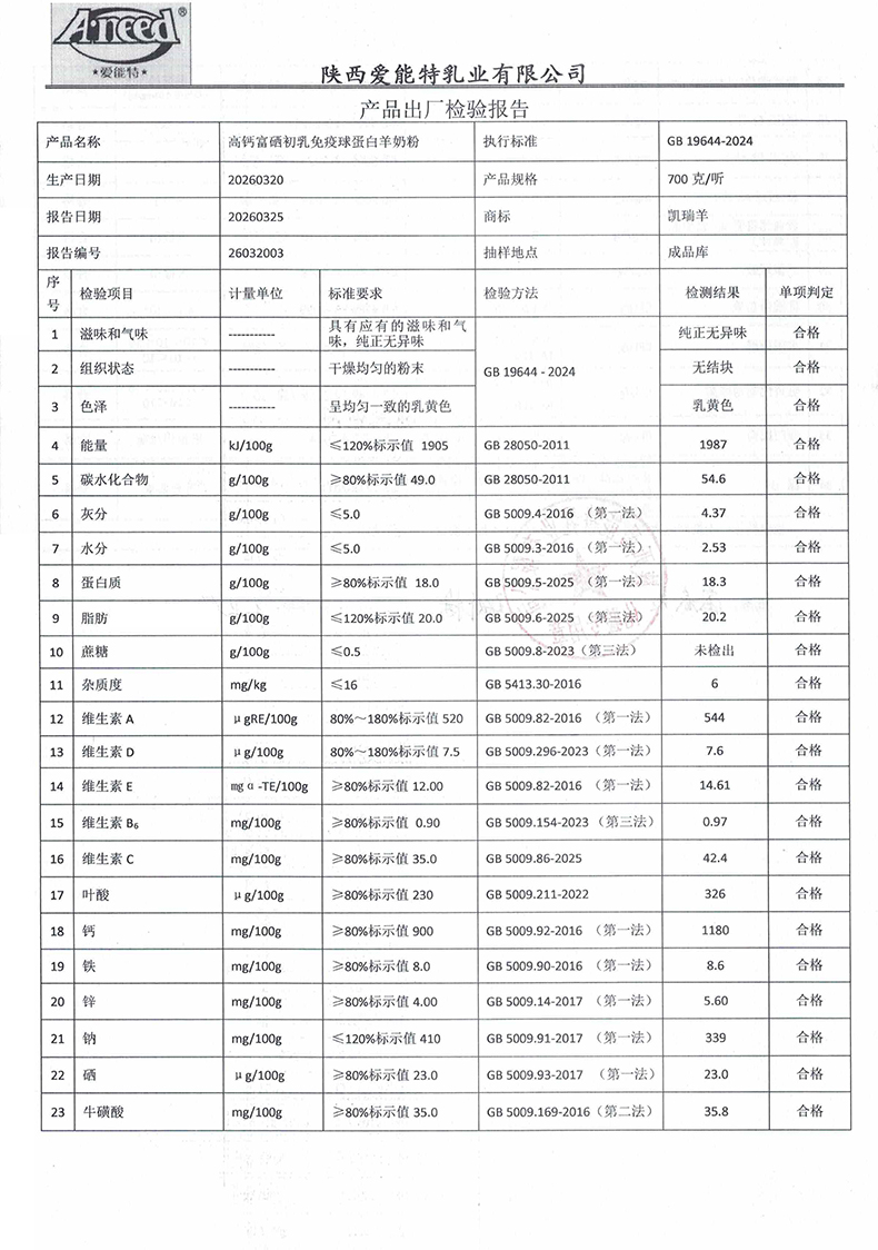 凯瑞羊高钙富硒初乳免疫球蛋白羊奶粉700克2026年03月20日检验报告
