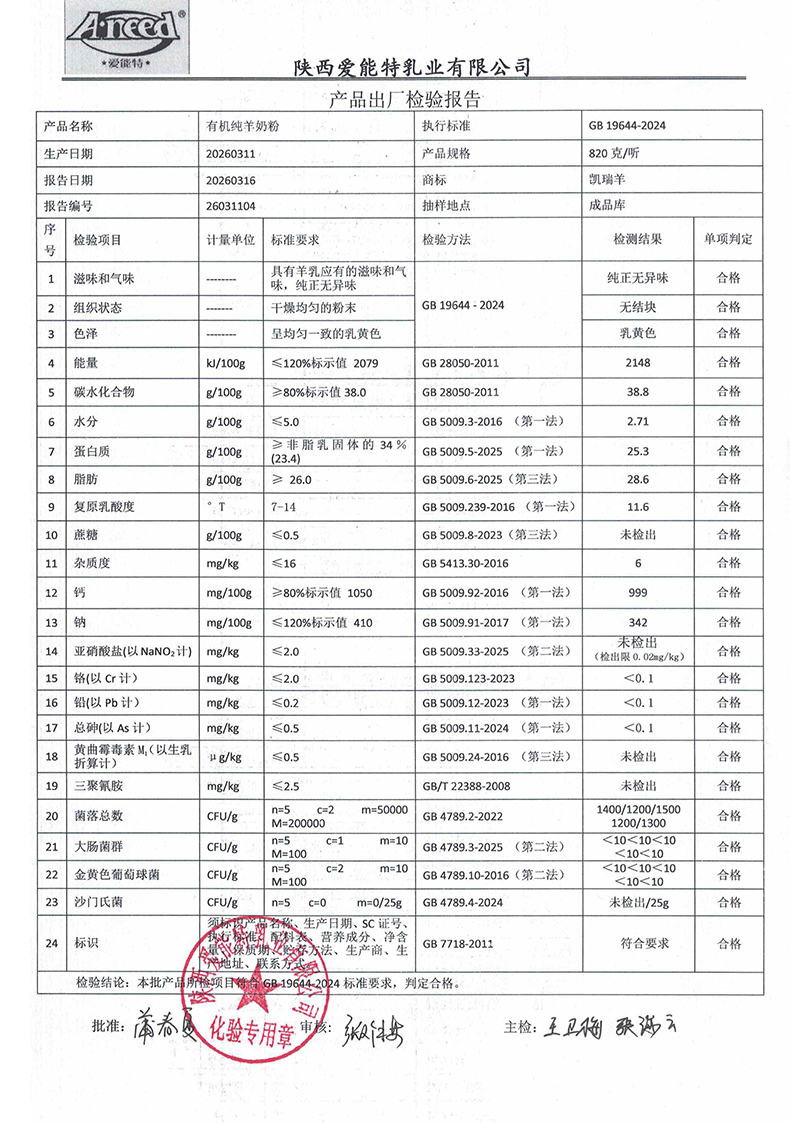 凯瑞羊有机纯羊奶粉820克2026年03月11日检验报告
