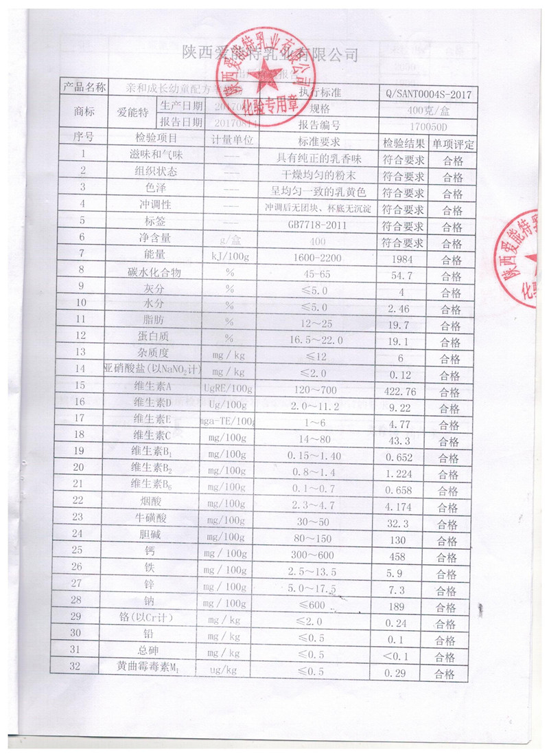 2017年8月11日爱能特亲和成长幼童配方羊奶粉400克检验报告