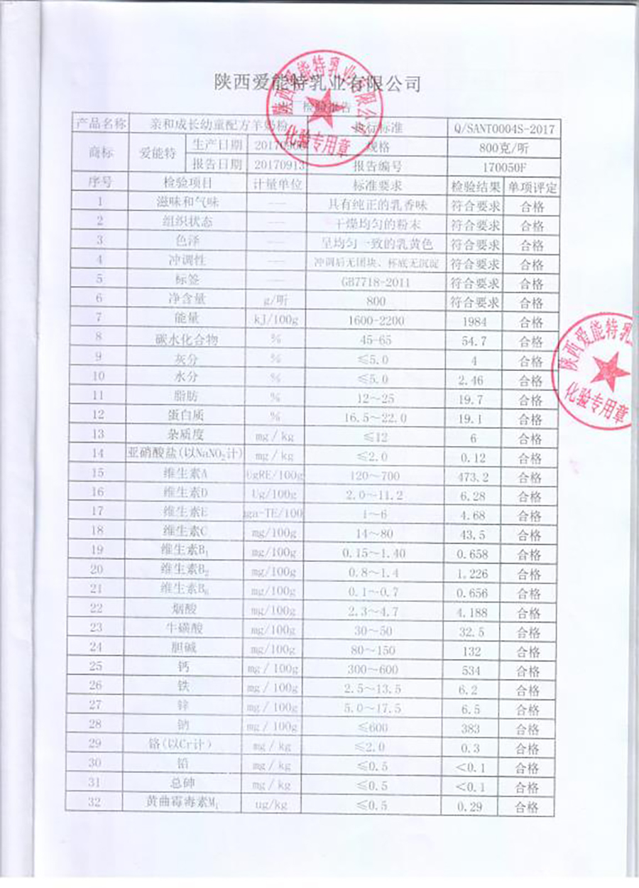 亲和成长幼童配方羊奶粉800克2017年9月6日检验报告