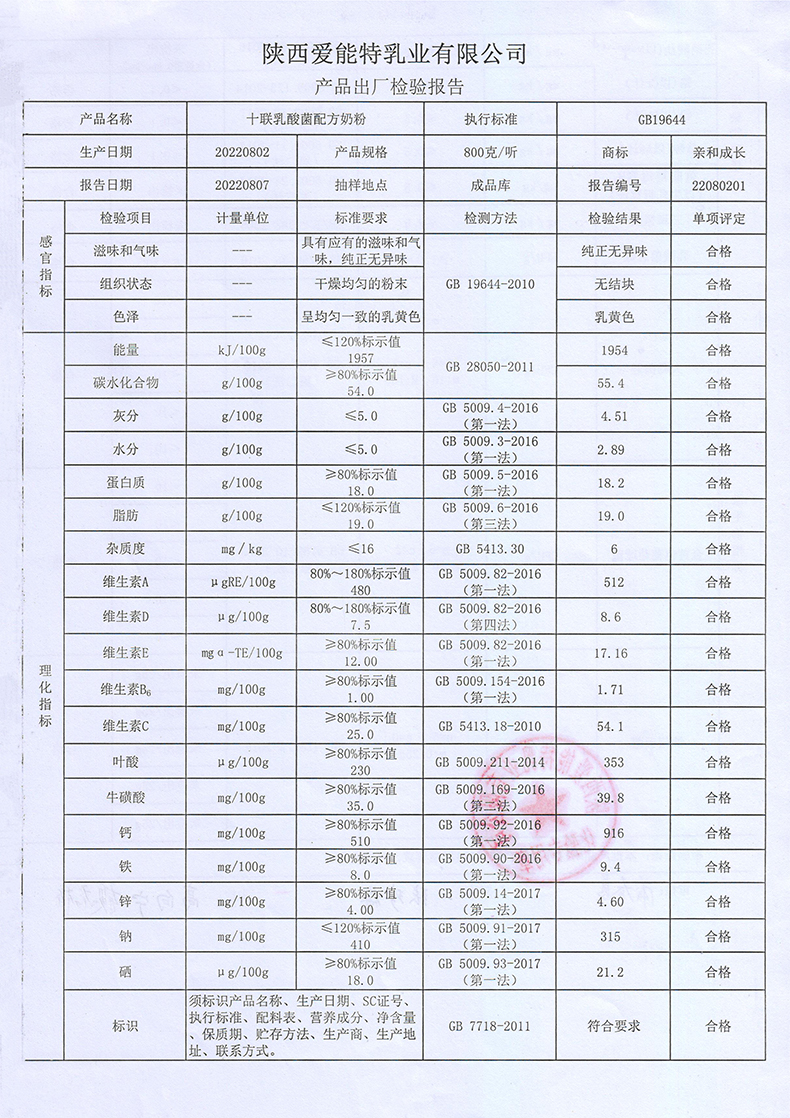 亲和成长十联乳酸菌配方奶粉800克2022年8月2日检验报告