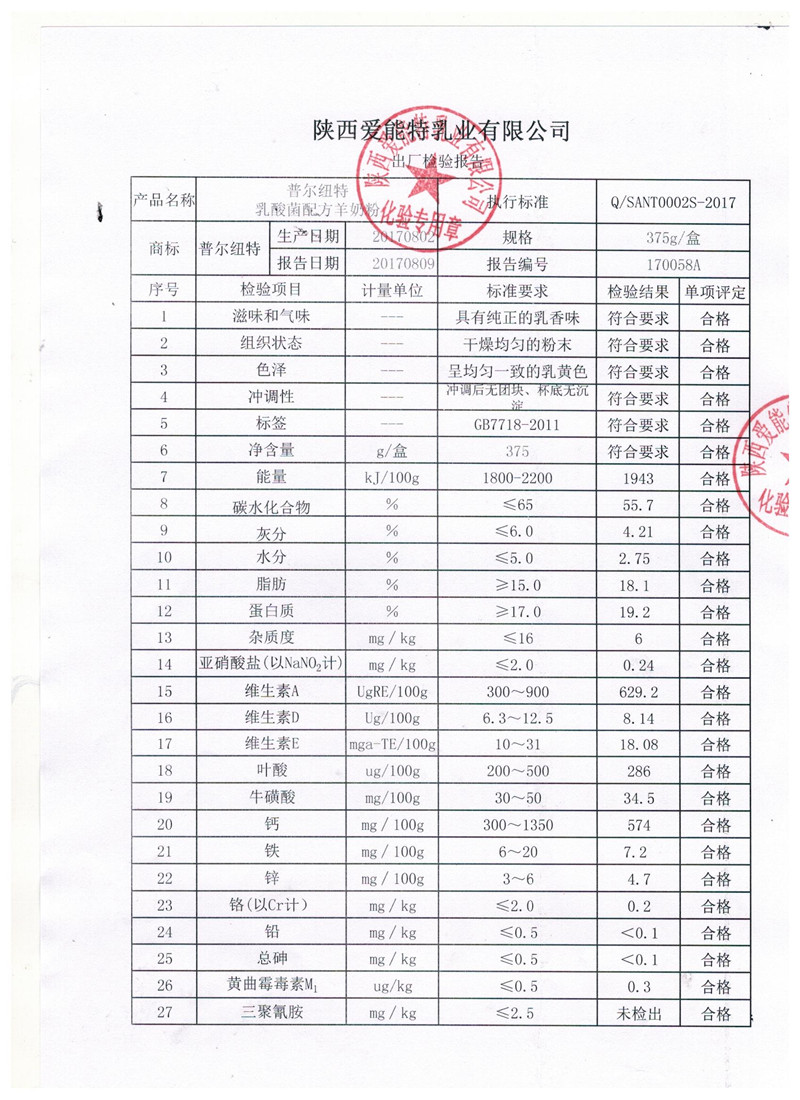 普尔纽特乳酸菌配方羊奶粉8月2日375克检验报告