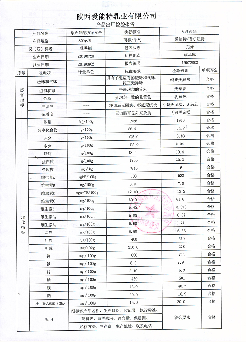 普尔纽特孕产妇配方羊奶粉800克2019年7月28日检验报告