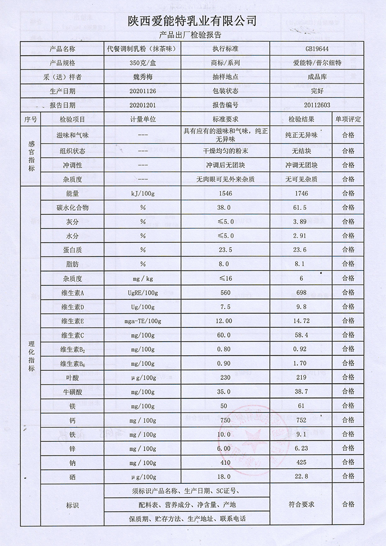 普尔纽特纤肌燃代餐调制乳粉(抹茶味)350克2020年11月26日检验报告
