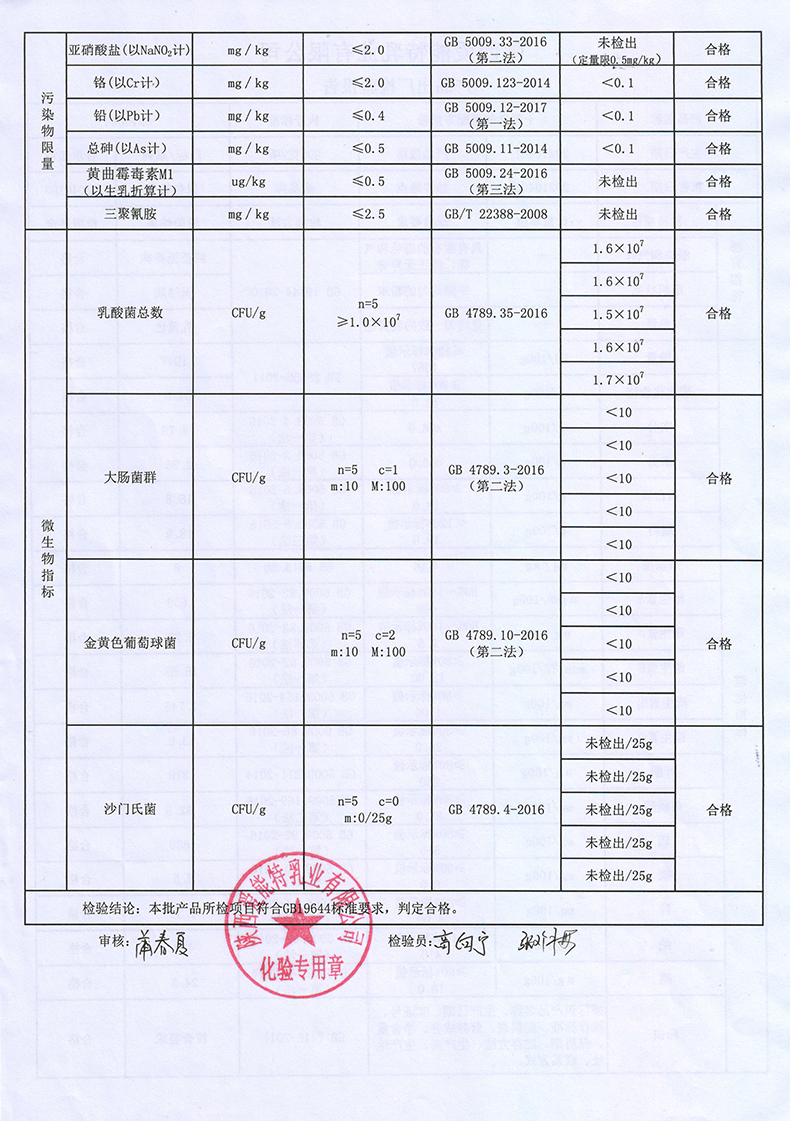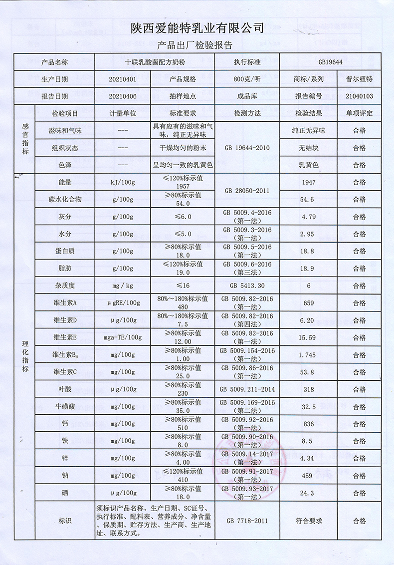 普尔纽特十联乳酸菌配方奶粉800克2021年4月1日检验报告