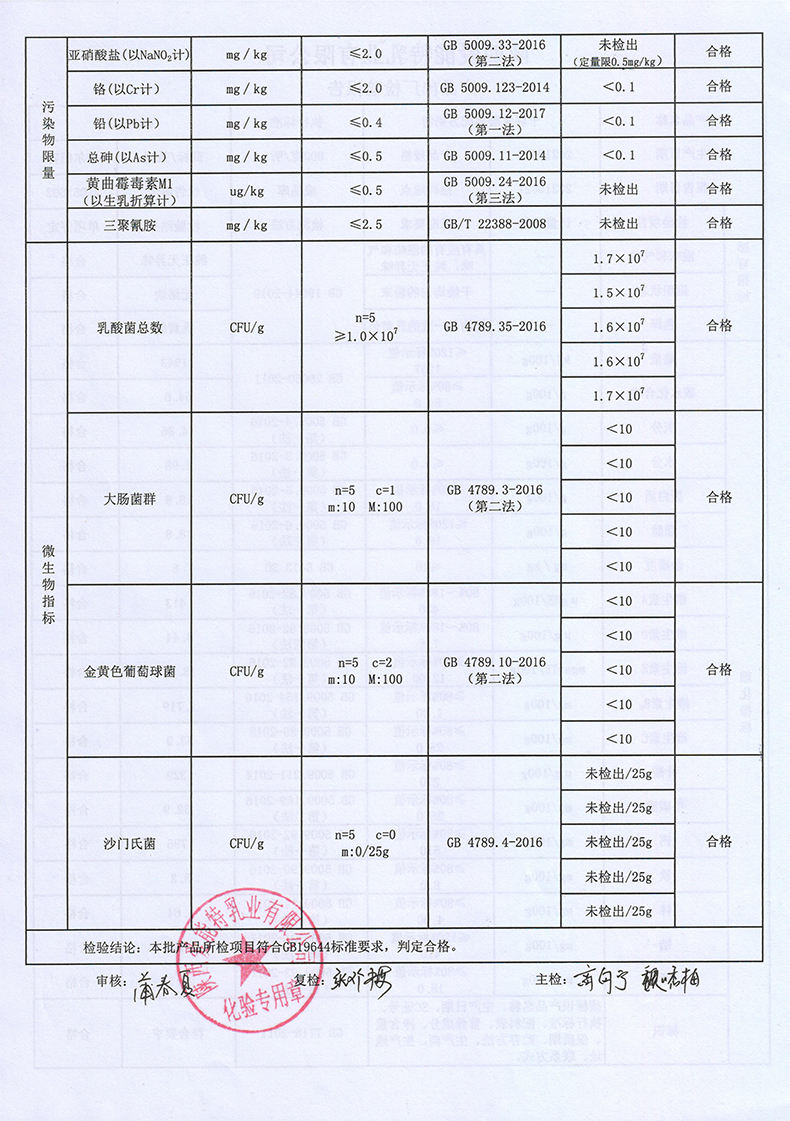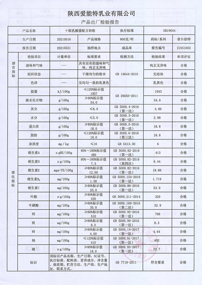 普尔纽特十联乳酸菌配方奶粉800克2021年5月16日检验报告