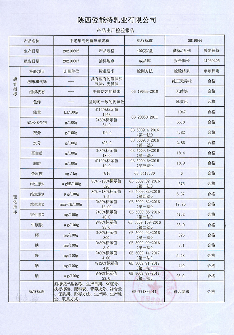[下一页] 普尔纽特纯羊奶粉320克2021年6月2日检验报告
