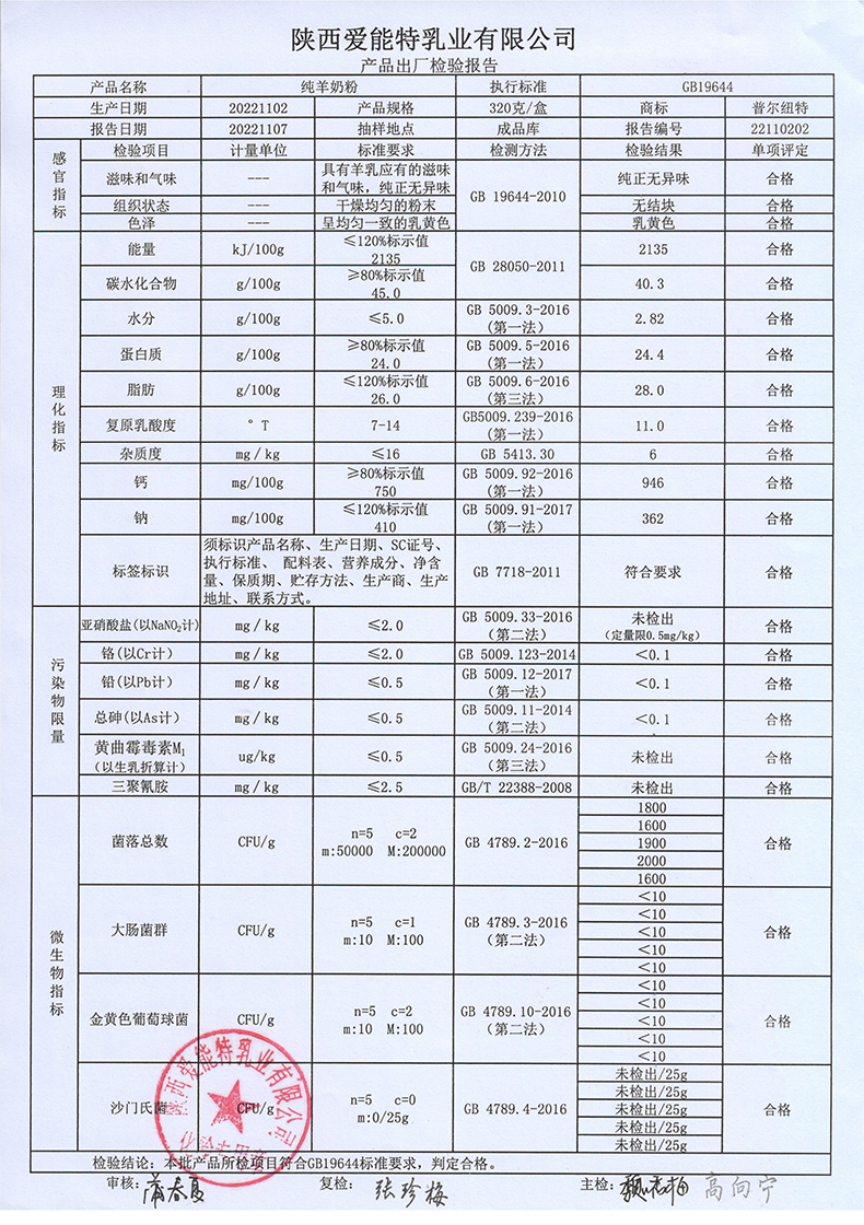 普尔纽特纯羊奶粉320克2022年11月2日检验报告