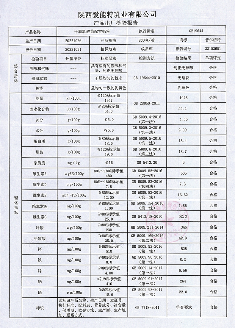 普尔纽特十联乳酸菌配方奶粉800克2022年10月26日检验报告