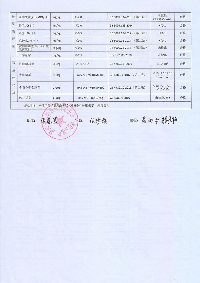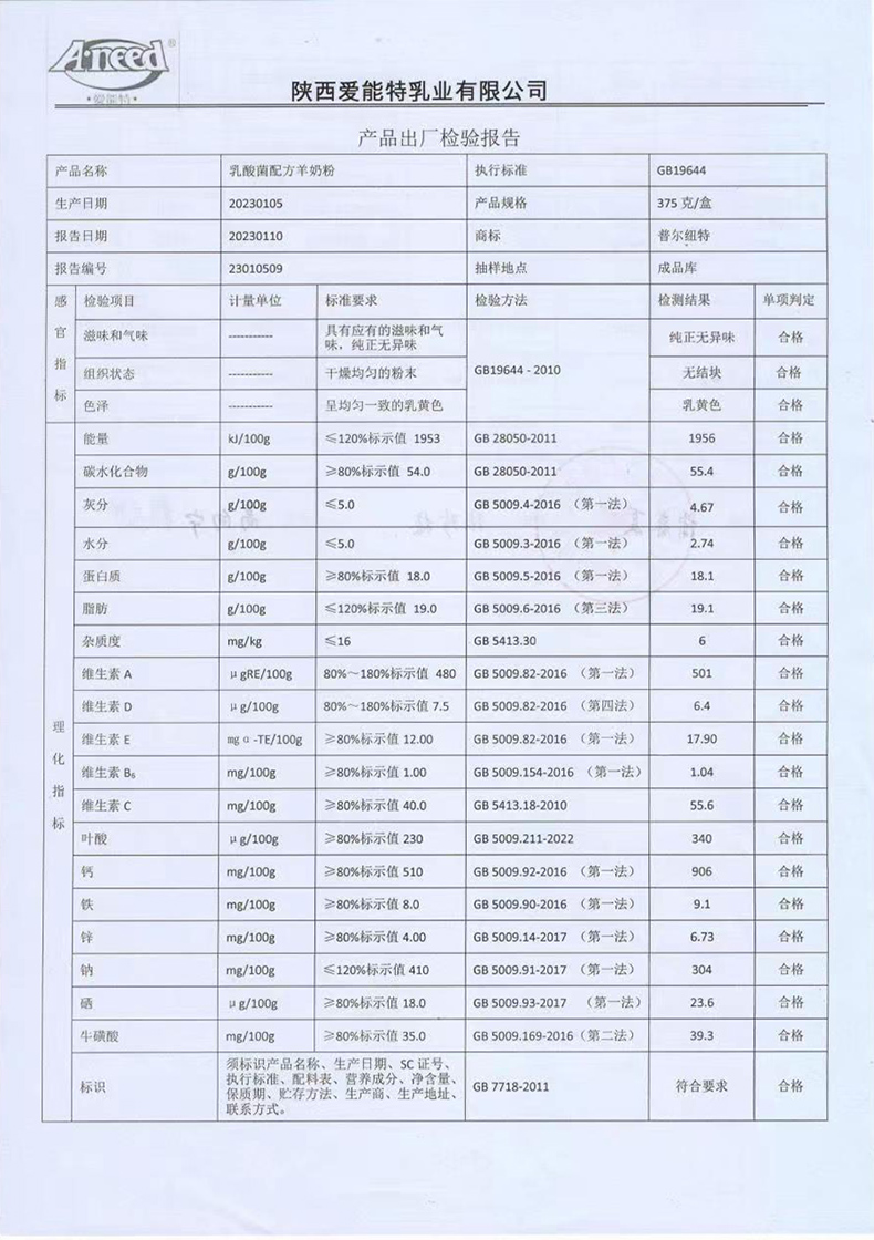 普尔纽特乳酸菌配方羊奶粉375克2023年1月5日检验报告