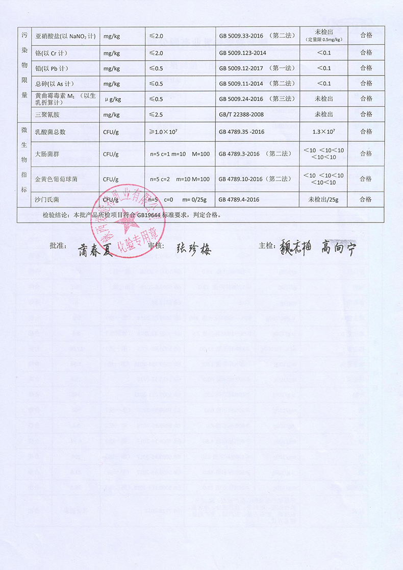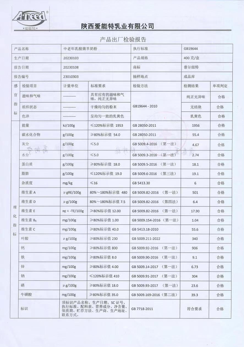 普尔纽特中老年乳酸菌羊奶粉400克2023年1月3日检验报告