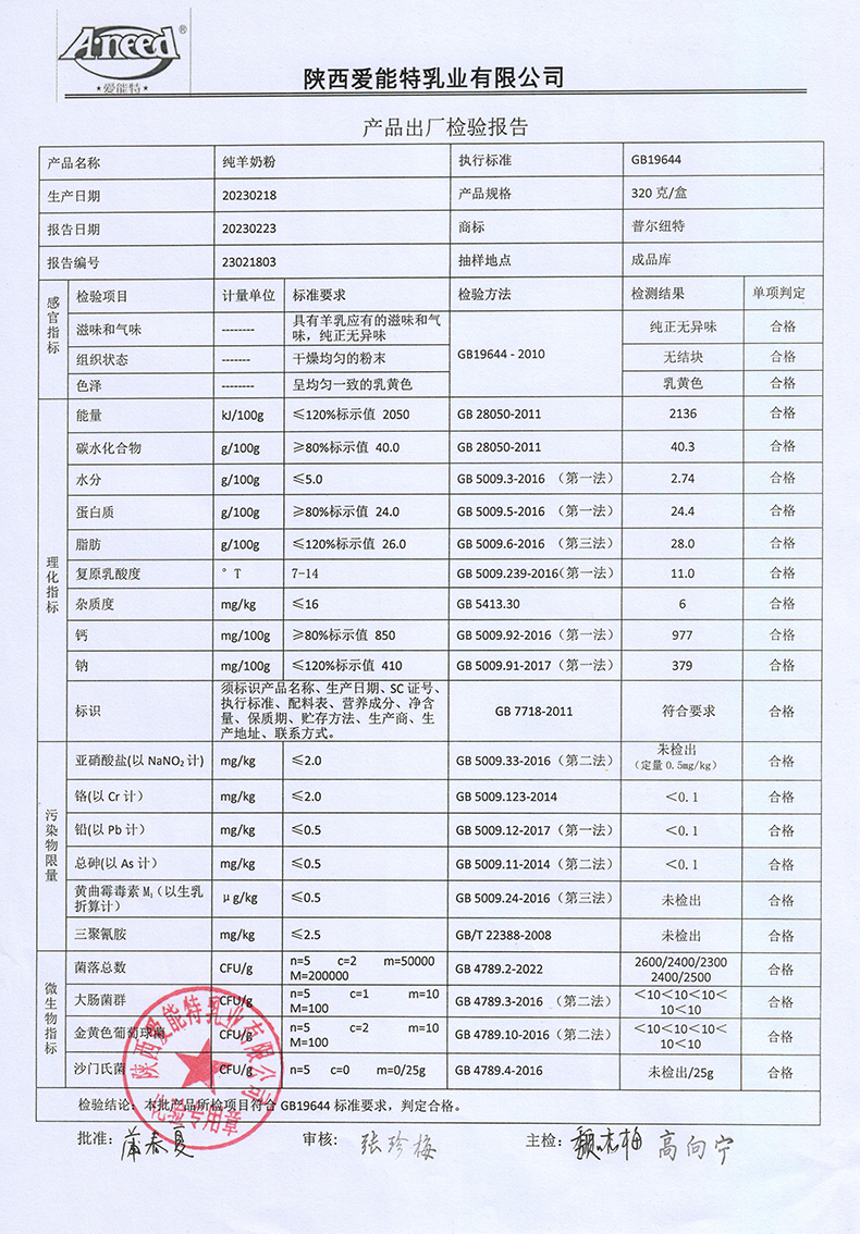 普尔纽特纯羊奶粉320克2023年2月18日检验报告