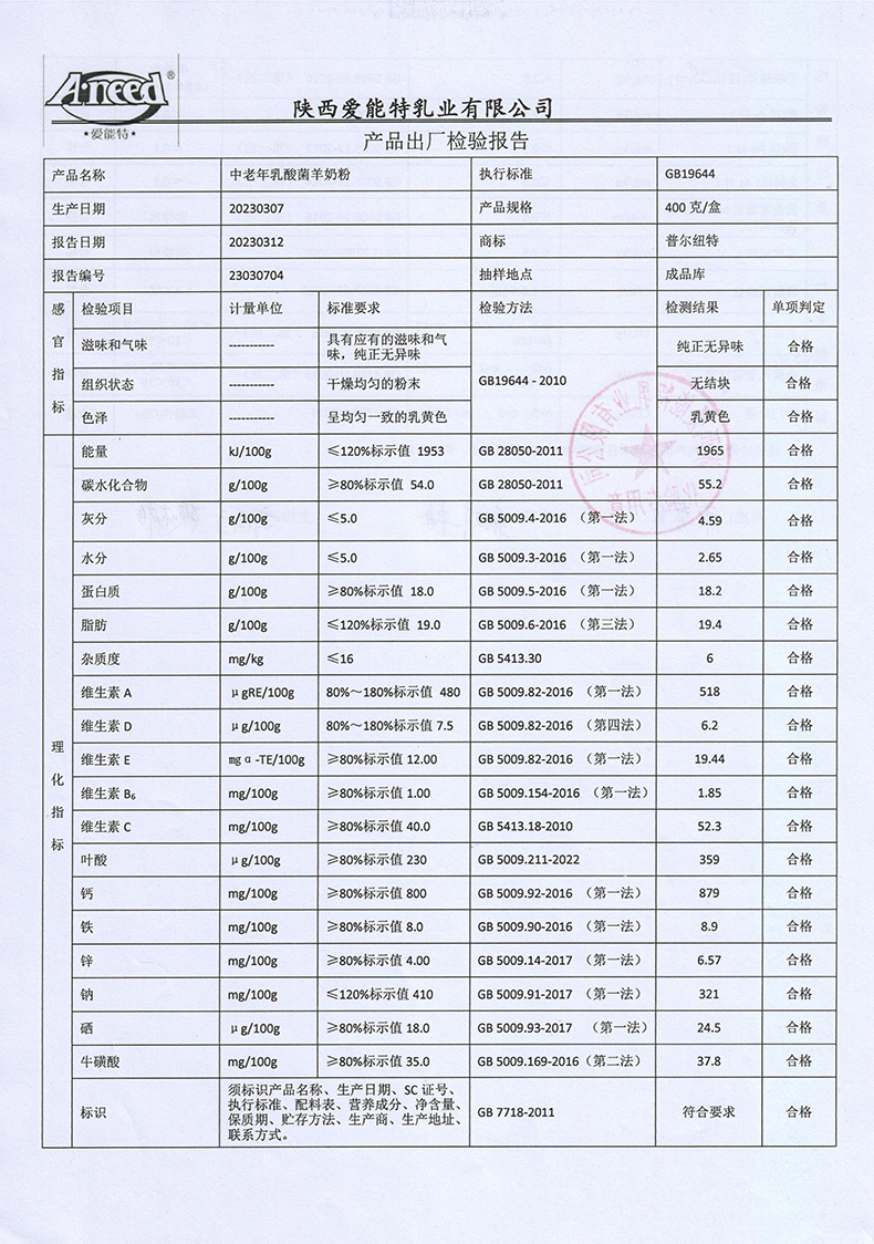普尔纽特中老年乳酸菌羊奶粉400克2023年3月7日检验报告