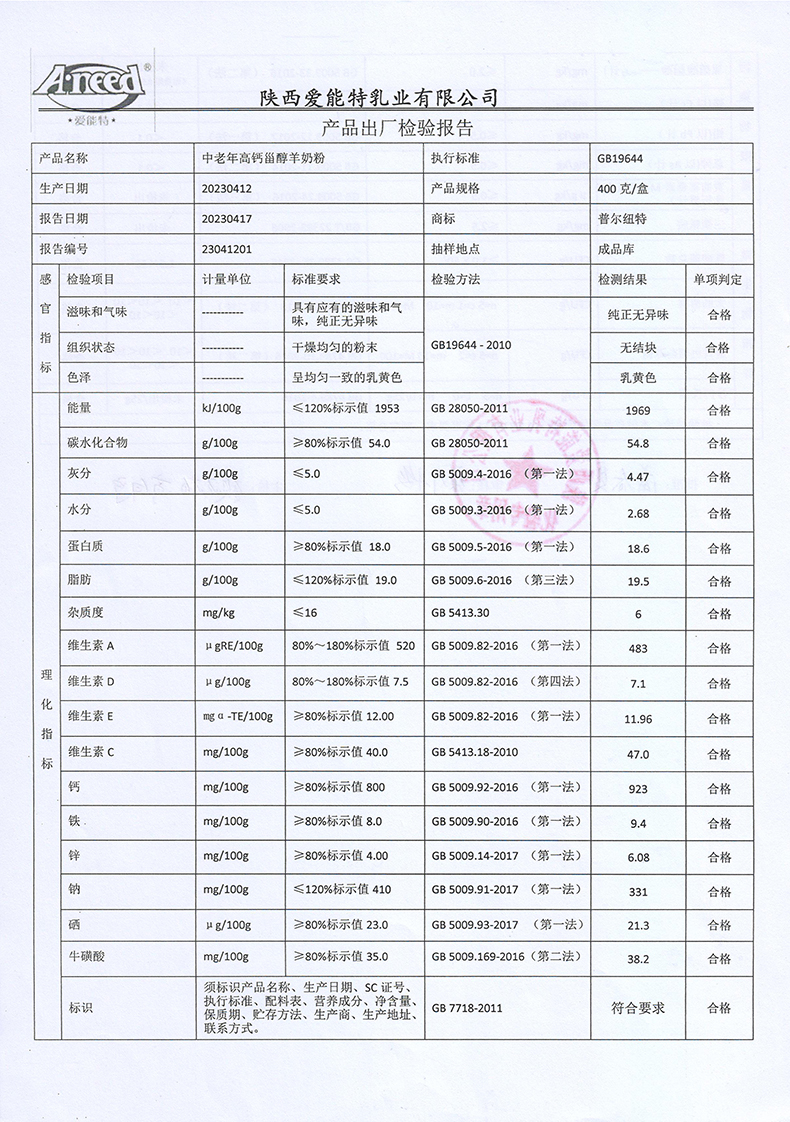 普尔纽特中老年高钙甾醇羊奶粉400克2023年4月12日检验报告
