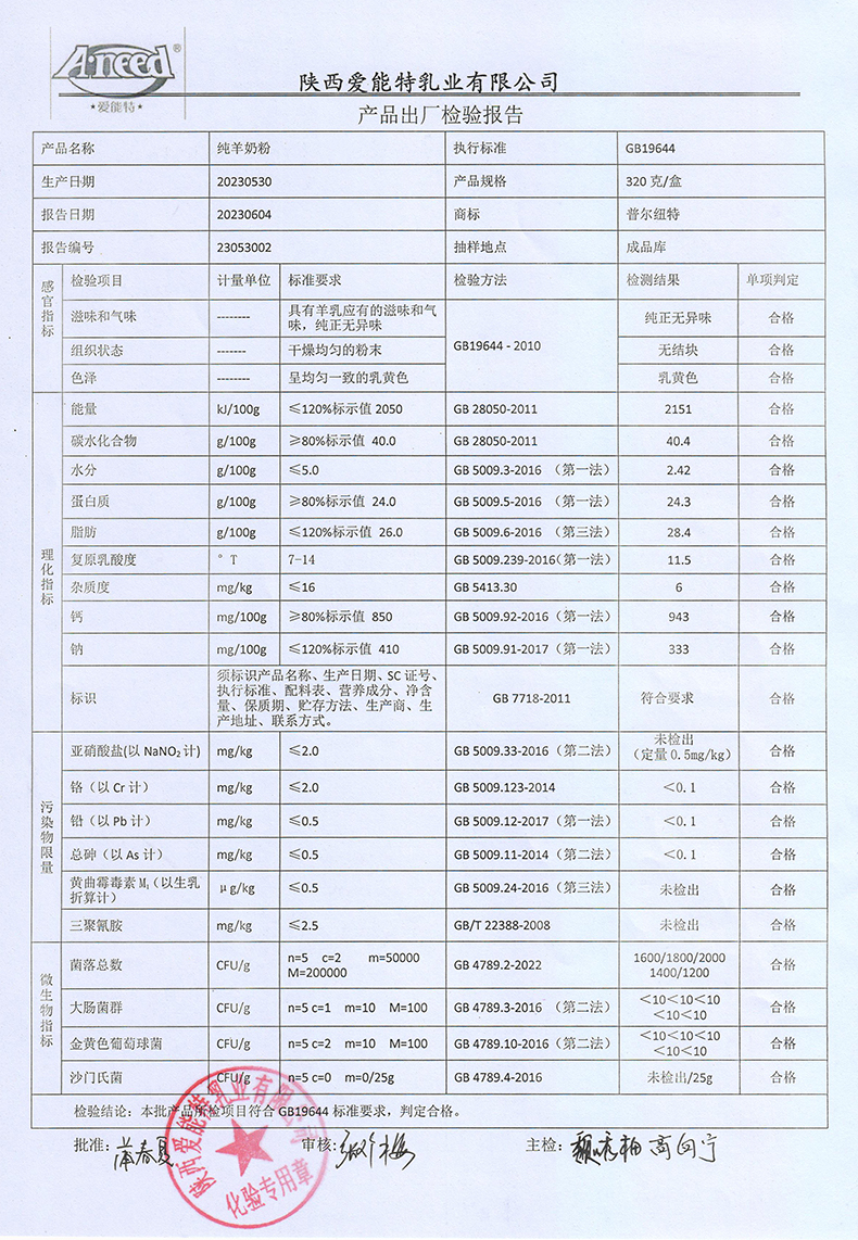 [下一页] 普尔纽特纯羊奶粉320克2023年5月17日检验报告