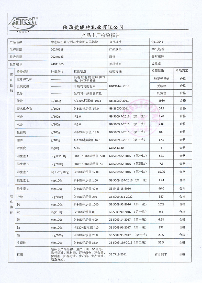 普尔纽特中老年初乳专利益生菌配方羊奶粉700克2024年1月18日检验报告
