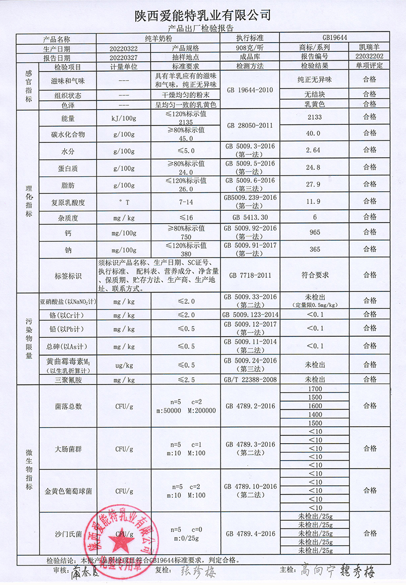 凯瑞羊纯羊奶粉908克2022年3月22日检验报告
