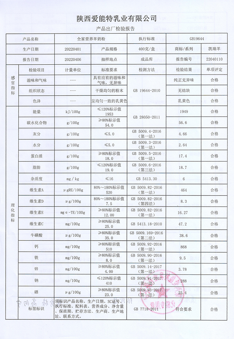凯瑞羊全家营养羊奶粉2022年4月1日检验报告