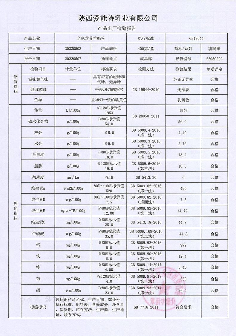 凯瑞羊全家营养羊奶粉400克2022年5月2日检验报告