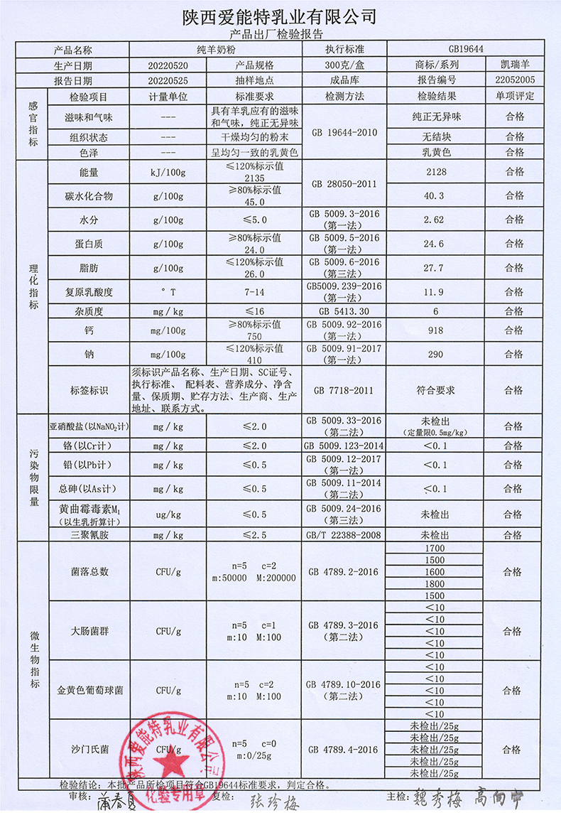 凯瑞羊纯羊奶粉300克2022年5月20日检验报告