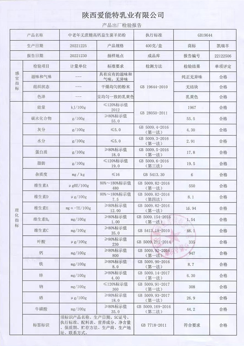 凯瑞羊中老年无蔗糖高钙益生菌羊奶粉400克2022年12月25日检验报告