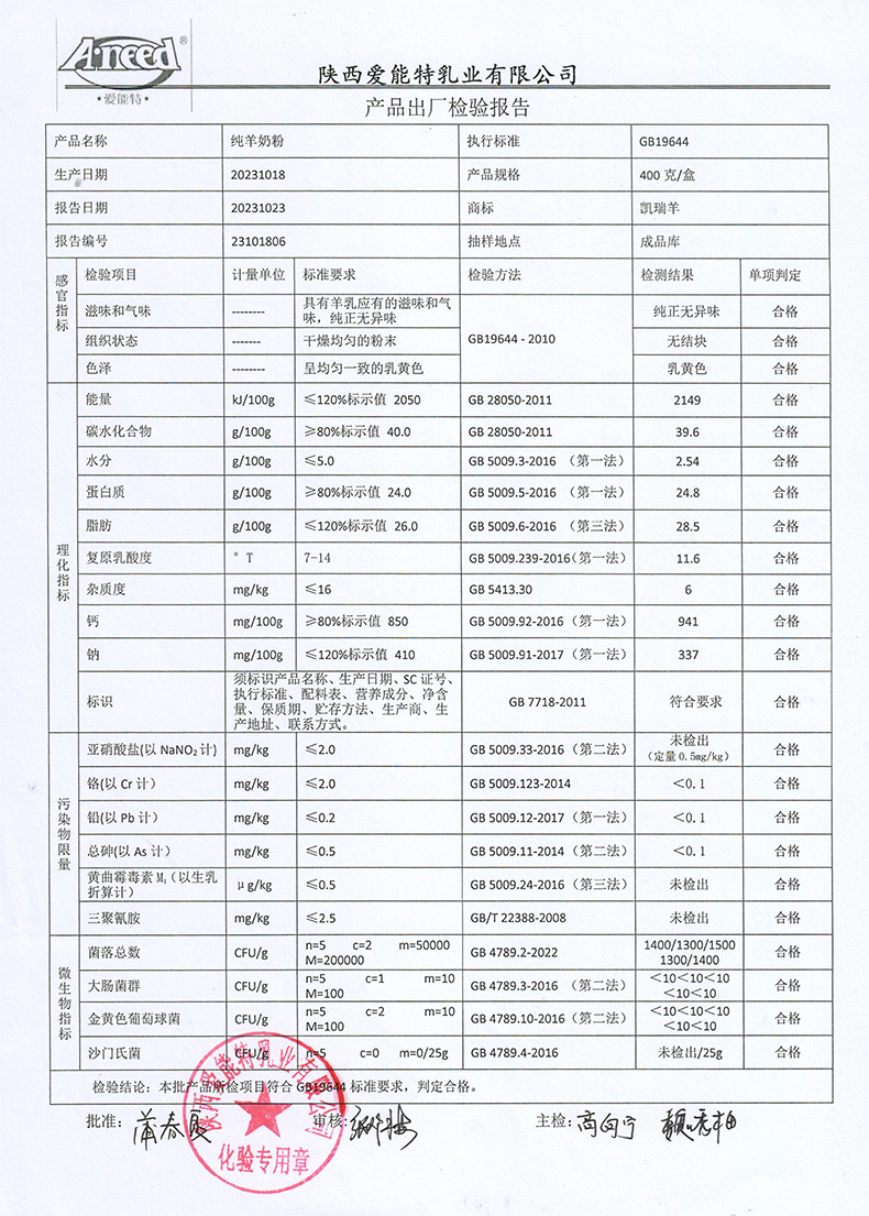 凯瑞羊纯羊奶粉400克2023年10月18日检验报告