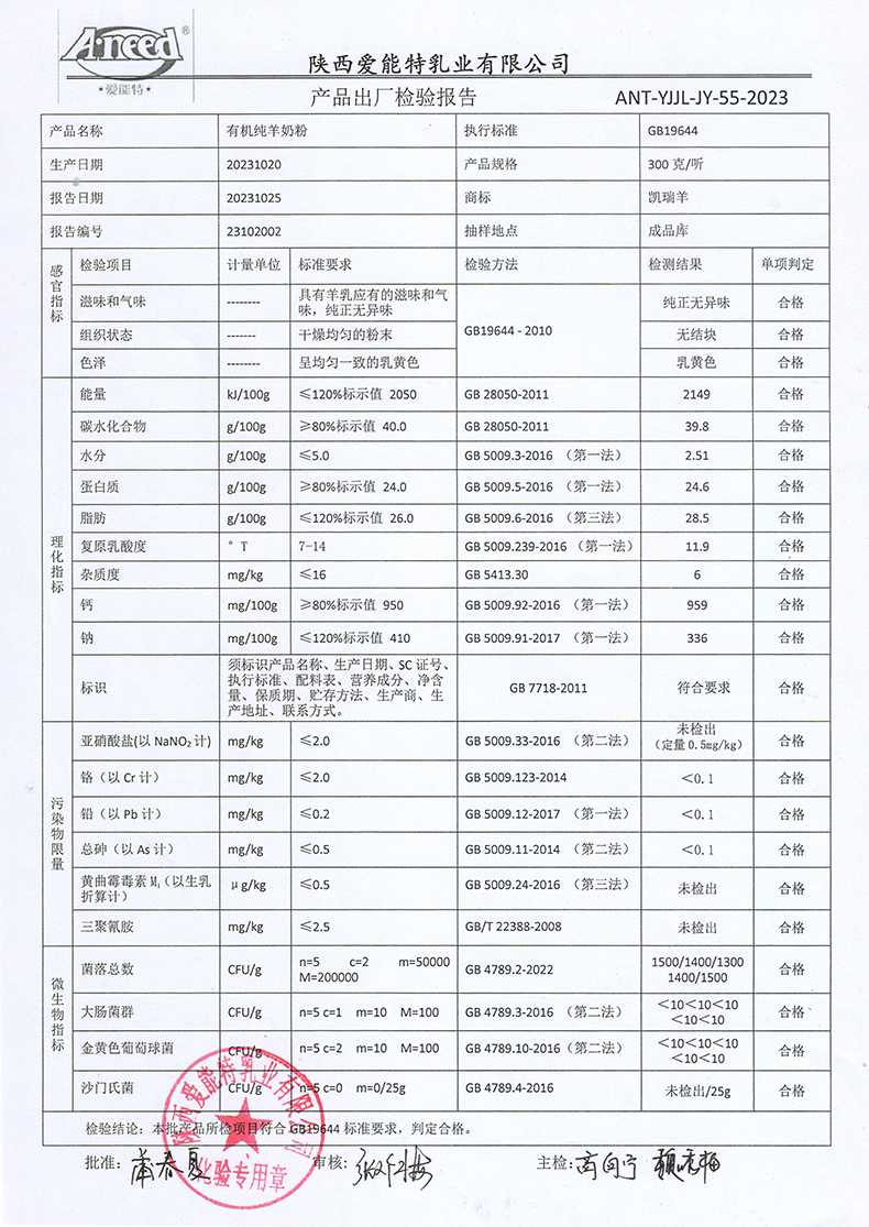 [下一页] 凯瑞羊纯羊奶粉400克2023年10月18日检验报告