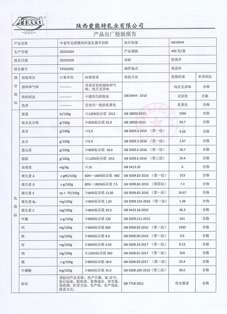 凯瑞羊中老年无蔗糖高钙益生菌羊奶粉400克2023年10月24日检验报告