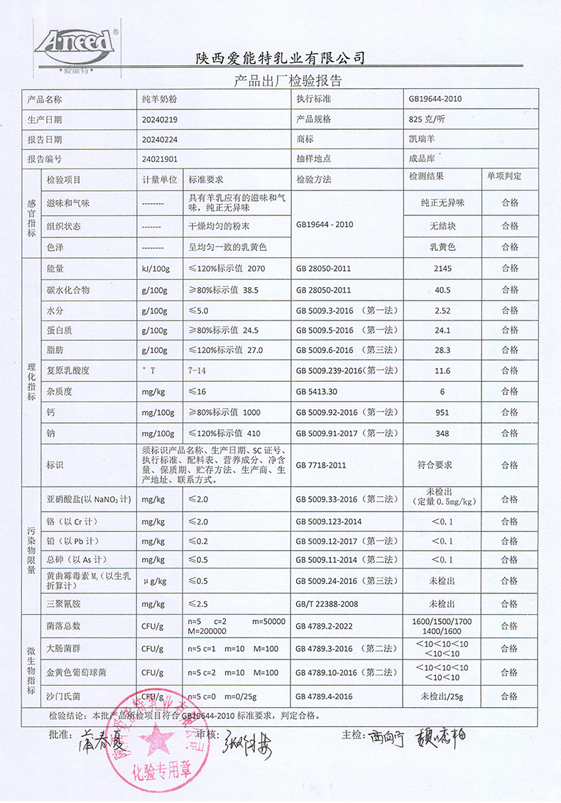 凯瑞羊纯羊奶粉825克2024年2月19日检验报告