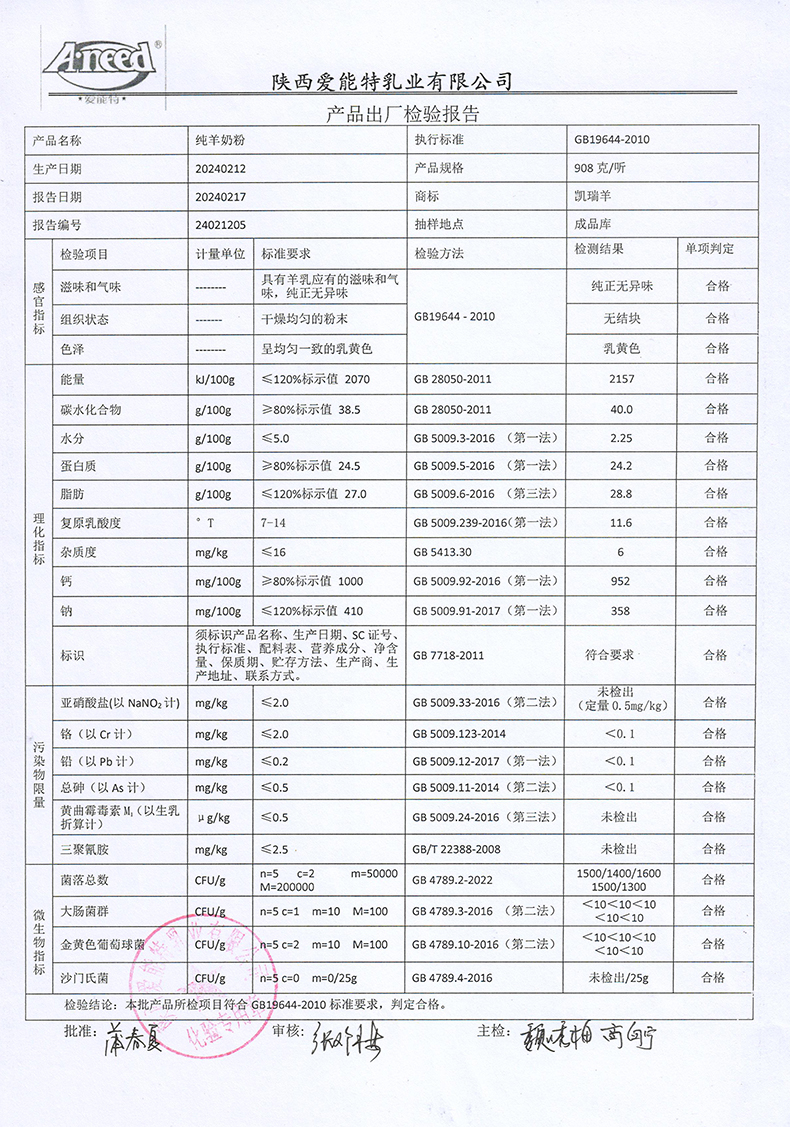 [下一页] 凯瑞羊纯羊奶粉825克2024年2月19日检验报告