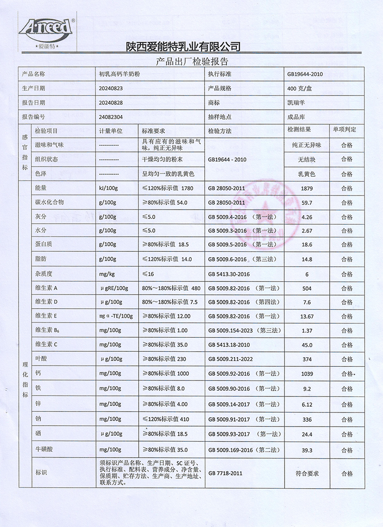 凯瑞羊初乳高钙羊奶粉400克2024年8月23日检验报告