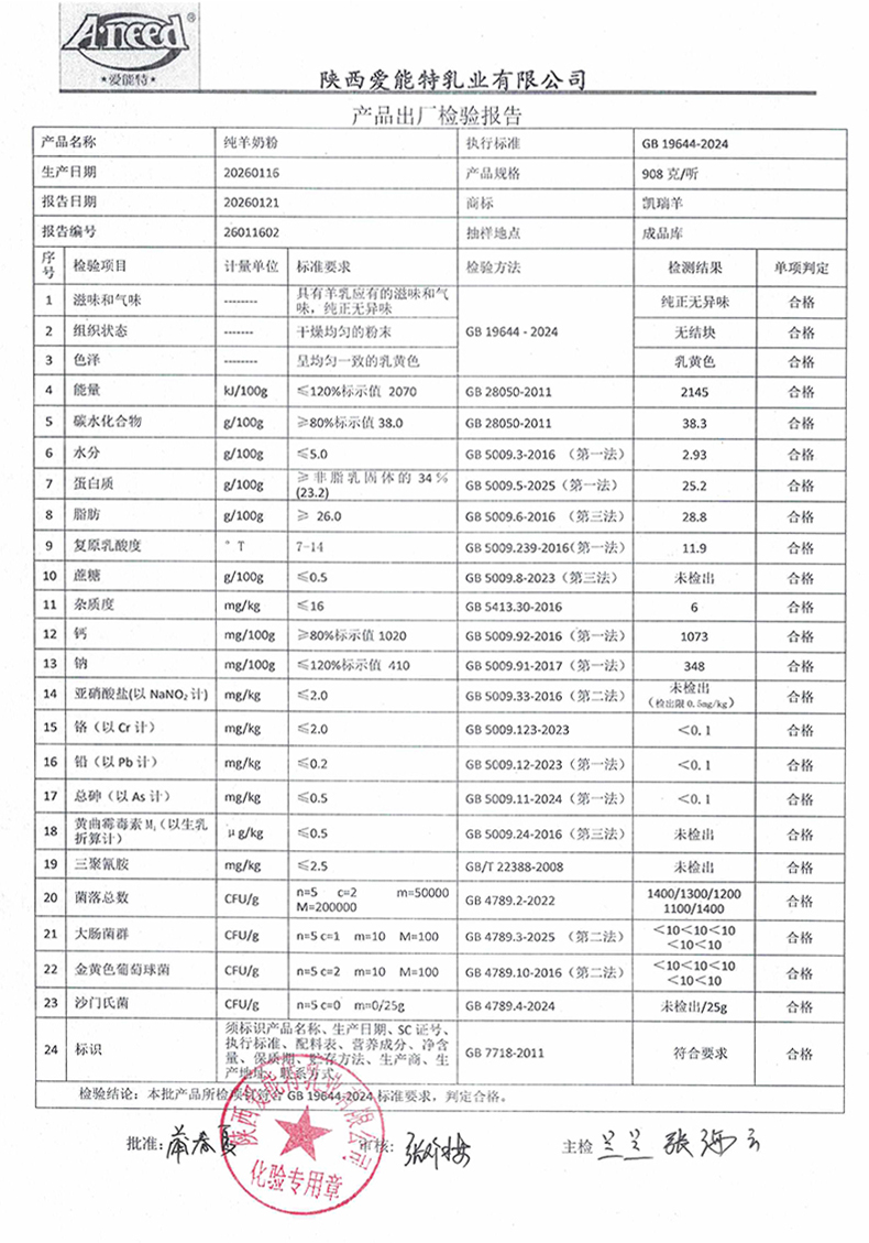 凯瑞羊纯羊奶粉908克2026年01月16日检验报告