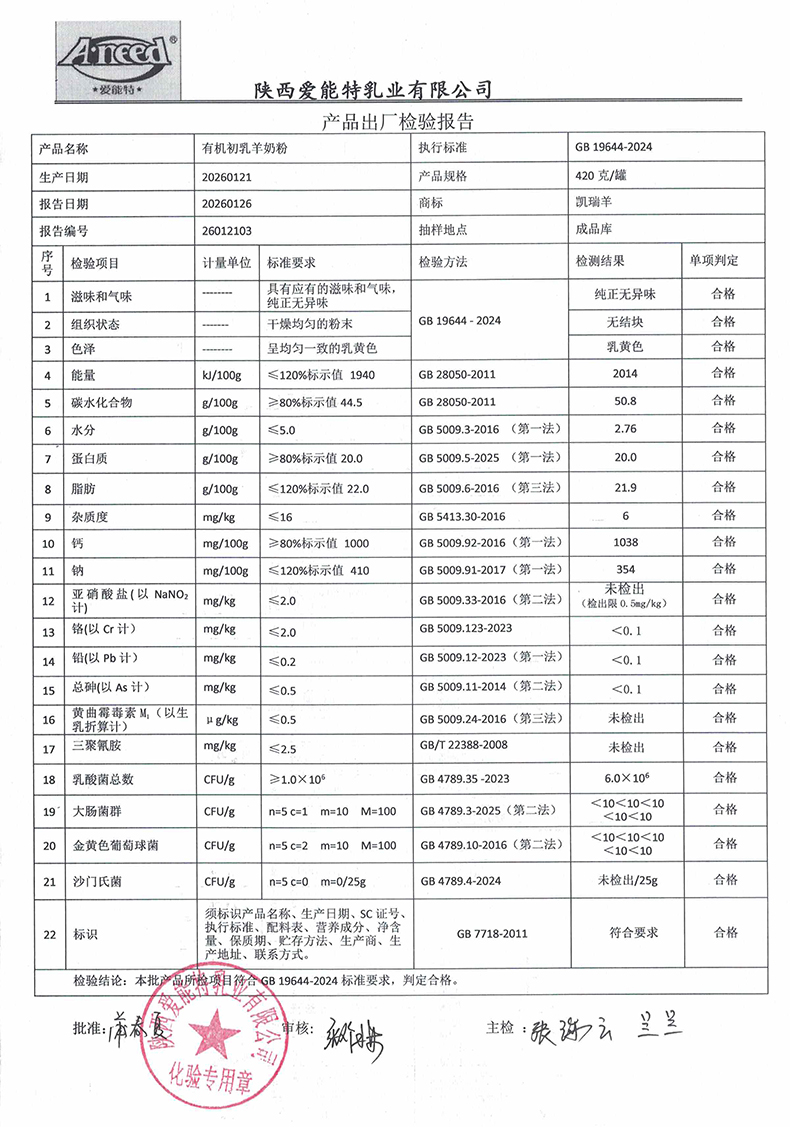 凯瑞羊有机初乳羊奶粉420克2026年01月21日检验报告